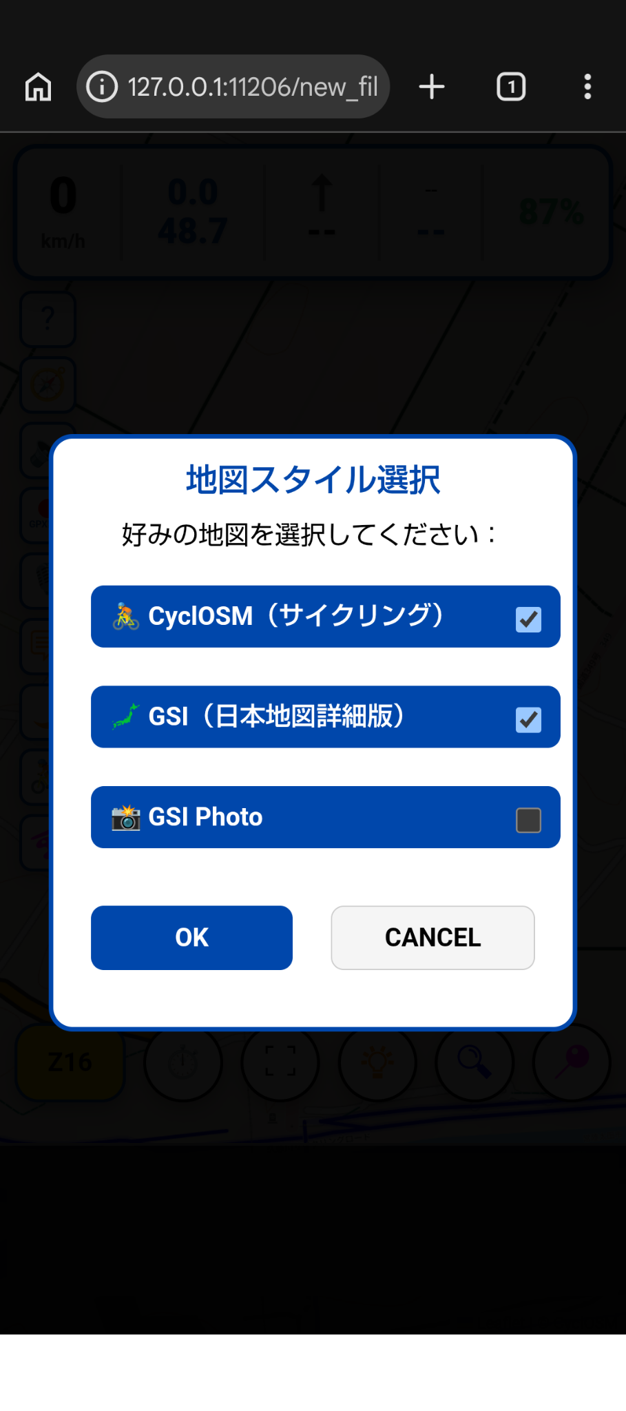 - サイクリスト:マップ選択(CyclOSM, GSI, GSI Photo)
