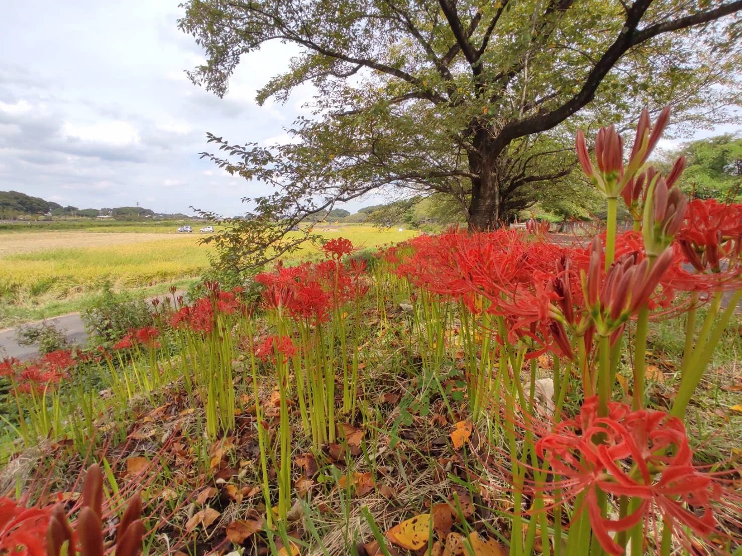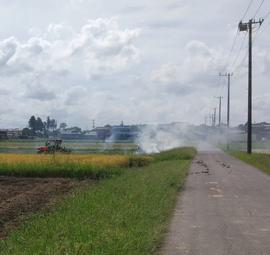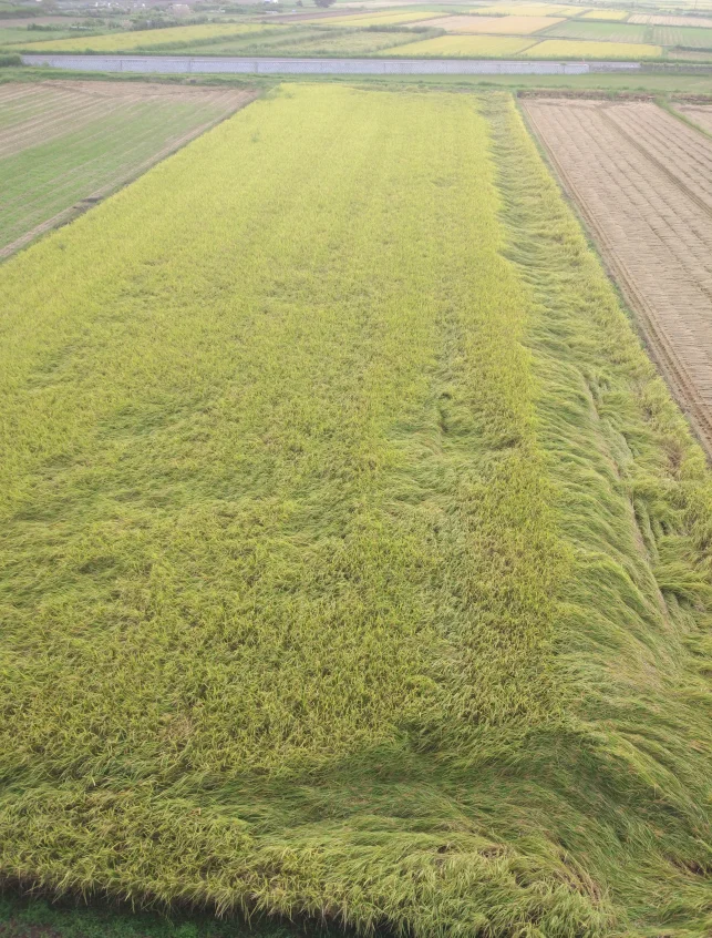Une fois, nous nous sommes arrêtés sur un pont, avec une vue en plongée sur une rizière en partie aplatie. J’ai récemment traduit quelques documents qui présentent la riziculture aux Africains, dans le cadre de l’aide japonaise au développement, et si j’ai bien retenu ma leçon en traduisant, c’est sous l’effet d’une trop forte densité de repiquage des plants qu’ils s’affaissent comme ceci, une fois les grains mûrs et lourds, la charge augmentant vraisemblablement lorsque la pluie les alourdit encore et que le vent s’en mêle.