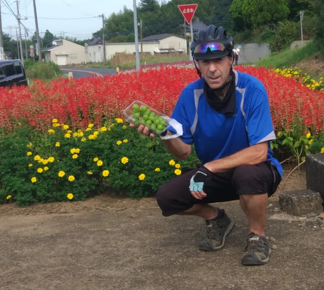 À un tournant, il y avait un kiosque d’agriculteurs qui vendaient eux-mêmes les fruits et légumes du terroir. Il n’était que 8h30, la petite affiche disait que ça ouvrait à 9h00, mais ils m’ont dit qu’ils étaient ouverts (difficile d’être fermé à ciel ouvert comme ça…), alors j’ai pris des raisins verts.