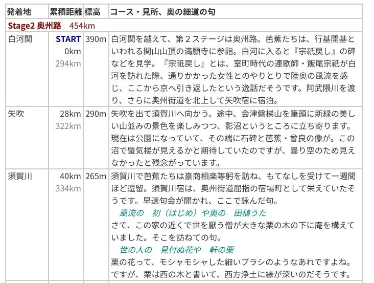 En plus de la distance parcourue et de l’altitude des sites, le tableau présente, dans la colonne de droite, une brève description de chaque section à franchir, les lieux à visiter, et, ici et là, quelques haïkus de Bashō. Comme celui-ci, composé pendant un séjour à Sukagawa (須賀川), ancien gîte d’étape (relais).
