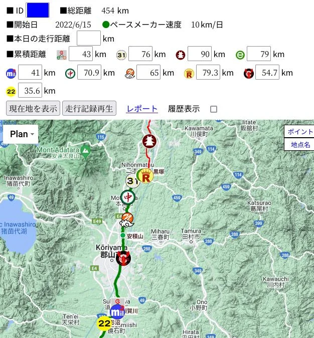 Comme je disais, dans le haut de la page il y a un tableau. Il indique la longueur de la section (454 km), le jour de début de la course (16 juin 2022), la vitesse à laquelle se déplace le pacemaker, en l’occurrence 10 km/jour. Ensuite, la distance parcourue pendant la journée (本日の走行距離) ; c’est ici que les joueurs viennent inscrire les kilomètres qu’ils ont parcouru réellement dans la journée (promenade, jogging, etc.). Et finalement, la distance totale parcourue (littéralement « distance cumulée », 累積距離) de chacun des joueurs est indiquée.