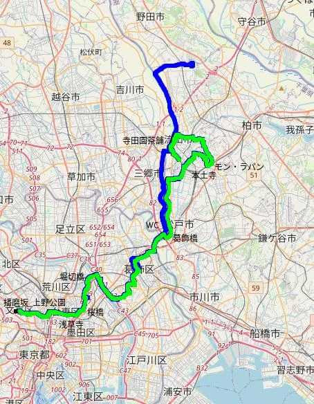Je suis donc parti de bon matin pour aller rencontrer le sous-groupe des quatre membres qui partaient d’Asakusa, et plus précisement du temple Sensōji (浅草寺). Ça représentait un parcours de 42 km, tracé en bleu sur la carte.