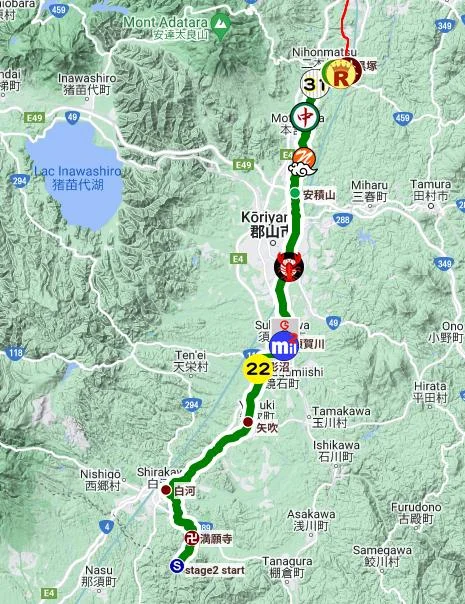 Il s’agit de la deuxième section de la sente, d’une longueur de 454 km. Elle commence à la barrière de Shirakawa, ancien poste-frontière entre la région centrale et les régions du nord du Japon. Et c’est aussi, dans la poésie, un utamakura (歌枕), ou motif poétique. En l’occurrence, la barrière de Shirakawa est un utamakura qui évoque l’automne et ses manifestations (feuilles rouges, etc).