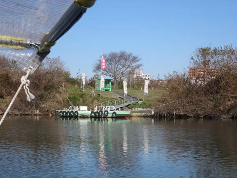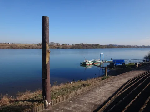 Nous nous trouvons dans une minuscule portion de la ville d’Abiko (我孫子市), et non dans celle de Toride (取手市), parce qu’autrefois le fleuve passait un peu plus au sud. Son cours sinueux a autrefois été détourné pour le « redresser », afin d’éviter les débordements qui survenaient fréquemment lors des crues provoquées par les typhons. Et comme il n’y avait pas encore de pont à cette époque, un ferry permettait aux gens du coin de faire la navette entre la partie principale de la ville et ce petit morceau qui s’est soudainement retrouvé isolé. Après la construction des ponts routiers et ferroviaires, le ferry a été conservé à des fins touristiques.