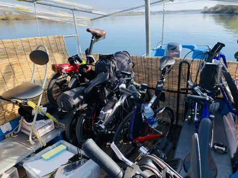 Le ferry habituel étant en cale pour des réparations, c’est une autre embarcation, plus petite, qui s’est approchée lentement du quai. Coup de chance, il y avait tout juste assez de place pour les six vélos pliés et pour les six bipèdes en balade.