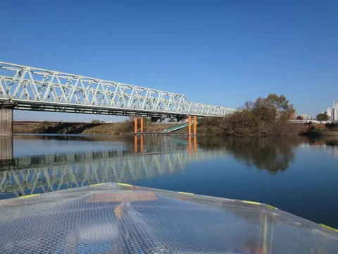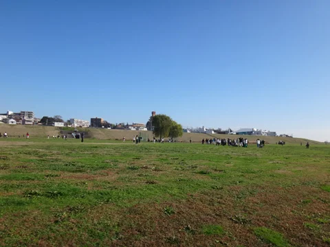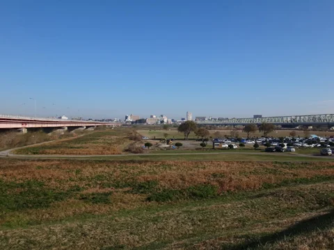 Du haut de la digue où se trouve la piste, on aperçoit la ville de Toride sur l’autre rive. La route R6 Mito-kaidō (水戸街道) traverse le fleuve à gauche, tandis qu’à droite c’est le pont ferroviaire de la ligne Jōban de JR qui relie les deux rives.