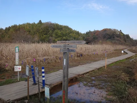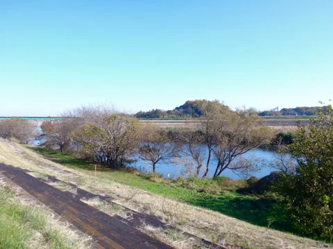 À l’extrémité de ce vaste espace d’activités de plein air, la piste passe à travers un long boisé, puis elle débouche, en bifurquant soudainement vers le nord, sur l’embranchement de la rivière Kokaigawa (小貝川).