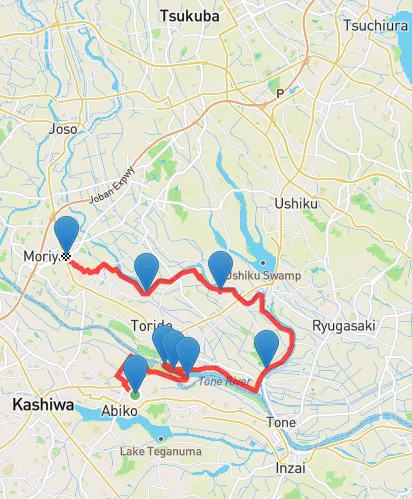 L’itinéraire suit encore le cours de la rivière Kokaigawa sur une distance d’environ 3 kilomètres, puis il bifurque en direction de la gare de destination, longeant d’abord un canal où des résidents du coin s’adonnent à la pêche, puis passant par les rues de la ville de Moriya.