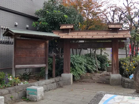 Notre itinéraire passe ensuite par le parc Senju Honchō (千住ほんちょう公園). À l’époque Edo, le panneau que l’on aperçoit sur la photo servait à afficher des avis publics (de réglementation).