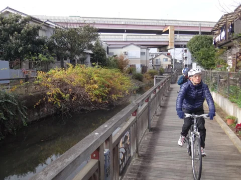 En quittant la rivière Furusumidagawa, les cyclistes empruntent l’ancienne route de Mito jusqu’au pont Nakagawa (中川橋), qui traverse la rivière du même nom à l’endroit même où il le faisait autrefois, à l’époque Edo. De là, le trajet emprunte le tracé de la rivière et la longe jusqu’au Grand pont Mizumoto (水元大橋).