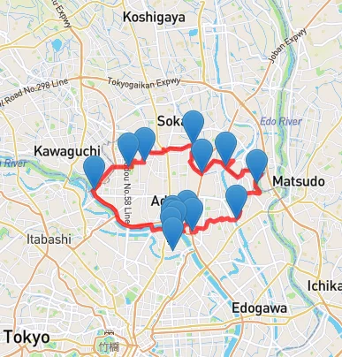 Résumé : Départ de la gare de Kitasenju, balade le long du fleuve Arakawa et de la rivière Furusumidagawa, sur l’ancienne route Mito Kaidō, le long de la rivière Nakagawa, dans le parc Mizumoto, le long des rivières Ōbagawa, Gakegawa, Ayasegawa et Kenagakawa, dans le parc Toneli, puis retour à la gare de Kitasenju par la piste cyclable du fleuve Arakawa.