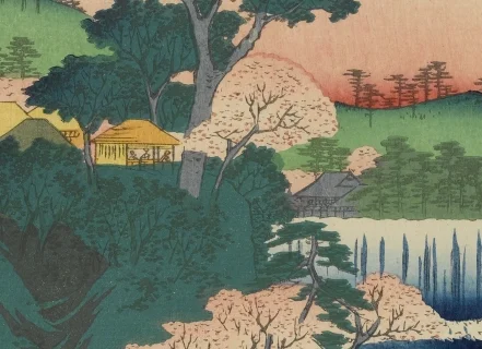 Barrage sur la rivière Otonashi à Ōji (1857, Printemps, planche 19 sur Wikipédia)