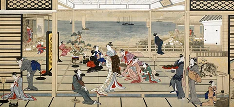 Ce même lupanar, Kitagawa Utamaro (≃1753 - 1806) l’a peint en 1788 sous le titre 品川の月 (littéralement, « Lune de Shinagawa »).