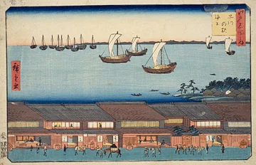 Dans sa série intitulée « Les Cinquante-trois Stations du Tōkaidō », Hiroshige a peint cette première station sous le titre « Shinagawa — Lever de soleil » (品川・日之出).