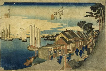 Situé à huit kilomètres du pont Nihonbashi, ce premier relais de l’ancienne route du Tōkaidō était une station d’hébergement divisée en deux sections, nord et sud, par la rivière Megurogawa (目黒川, autrefois appelée Shinagawa à ce point situé près de la baie). Très animée, la station Shinagawa-shuku comptait quelques centaines d’auberges pour accueillir les commerçants et autres voyageurs qui empruntaient cette route reliant Kyōto à Edo.