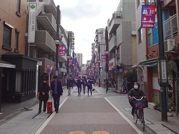 En y entrant, les cyclistes aperçoivent toute une série de lampadaires qui, des deux côtés de la rue, affichent verticalement et noir sur blanc « 北品川本通り商店会 » (Association des commerces de la rue principale de Kita-Shinagawa).