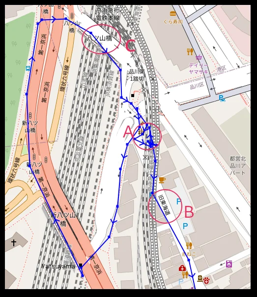 Point A : L’entrée de Shinagawa-shuku / Point B : L’ancienne route du Tōkaido (旧東海道) / Point C : Le pont Yatsuyama