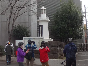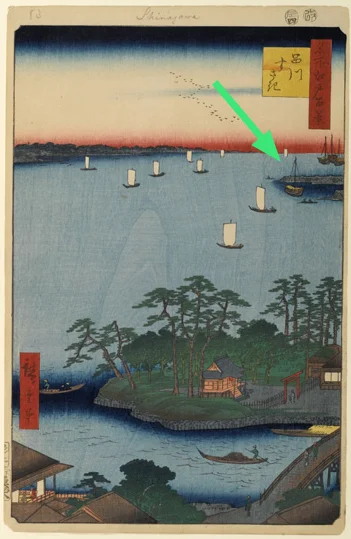 🚴 Dans le dernier billet, le groupe s’est arrêté devant la pierre tombale de la grosse baleine capturée autrefois dans la baie d’Edo. Nous allons maintenant poursuivre jusqu’à l’emplacement de l’estampe suivante. Il se trouve tout près de celui de l’estampe précédente, que voici, avec une flèche pointant vers une fortification militaire appelée godaiba en japonais.