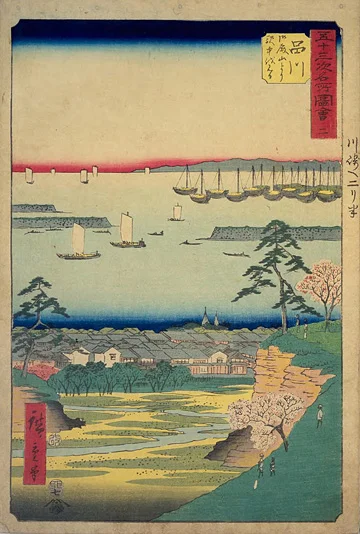 Sur une estampe de Hiroshige intitulée « Shinagawa » et publiée la même année dans une autre série d’estampes, on peut voir les mêmes lieux sous un angle différent qui montre la falaise excavée, l’ancienne station d’hébergement Shinagawa-shuku (où nous avons commencé cette balade), la baie et ses batteries de canons, qui s’avéreront inutiles et ne seront pas achevées, face à l’écrasante supériorité des fameux vaisseaux noirs…