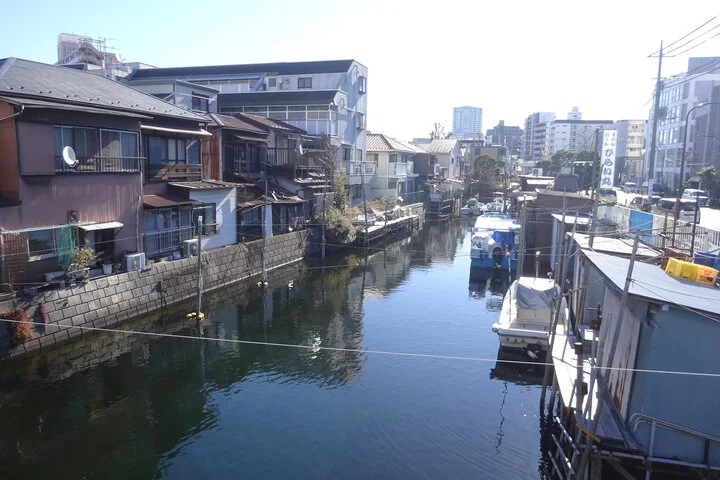 Samedi matin, j’ai pris cette photo depuis le pont Kita-Shinagawa (北品川橋), qui surplombe l’anse de Shinagawa (品川浦), c’est-à-dire au même endroit que sur la première photo du présent billet. Prise de l’autre côté du pont, celui d’où la rivière Meguro venait autrefois se jeter dans la baie, elle montre bien qu’il n’y reste plus qu’un trognon (excusez le terme) qui se termine en cul-de-sac à quelques dizaines de mètres de là. À droite, des cabanes de pêche, et à gauche, de vieilles maisons à peine protégées des crues par une petite haie de blocs de ciment. Quand on connaît les effets dévastateurs du passage des typhons, la montée des eaux qu’ils provoquent, ça fait frémir de regarder ces habitations à nos pieds, juste en bas du petit pont…