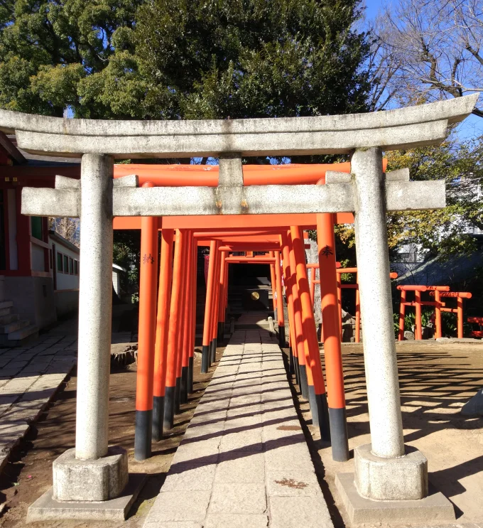 🚴 Dans le dernier billet, nous nous sommes quittés sur le sommet du monticule Shinagawa Fuji. Nous allons redescendre, quitter l’enceinte du sanctuaire de Shinagawa et nous diriger vers celui d’Ebara (荏原神社). Ce faisant, nous passons devant le sanctuaire Kashoku Inari (稼穡稲荷) où un gros Ginkgo biloba (イチョウ) attire l’attention avec ses protubérances bizarres en forme de stalactites, d’autant plus visibles en janvier que l’arbre a perdu toutes ses feuilles.