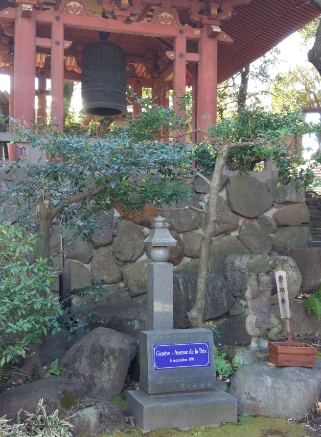 La grosse cloche de ce temple a beaucoup voyagé… Au 19e siècle, après avoir été exposée à Paris puis à Vienne, elle s’est comme qui dirait évanouie, avant de réapparaître quelques dizaines d’années plus tard à Genève, d’où elle a été rendue au Japon. Les échos du retour de cette cloche résonnent encore aujourd’hui sous la forme d’un accord de villes jumelées entre l’arrondissement de Shinagawa et la ville de Genève, et d’une rue qui a été renommée « Avenue de la Paix ».