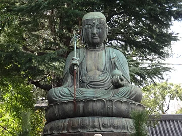 Le parcours passe ensuite par le temple Honsenji (品川寺). Y trône le premier des six gros jizō d’Edo, érigé en 1708 (le sixième et dernier le sera en 1720). Ces jizō étaient disposés le long des routes principales d’Edo. Celui-ci, appelé Bosatsu en japonais (菩薩), correspond en sanscrit au bodhisattva Kshitigarbha. Vous retiendrez ce nom si vous parlez couramment le sanscrit… moi je vais me contenter de Bosatsu, c’est plus facile à retenir pour ma petite caboche de vélo.