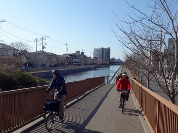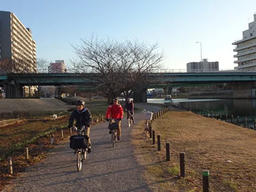La troisième et dernière estampe de cet arrondissement se trouve juste un peu plus au nord. Pour s’y rendre, les vélos roulent le long de l’Ancienne rivière Nakagawa (旧中川).
