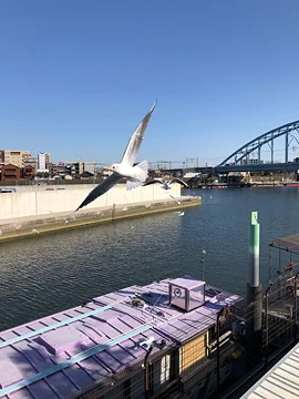 Une péniche, une mouette en plein vol et, derrière, l’extrémité bétonnée de l’île Myōken-jima