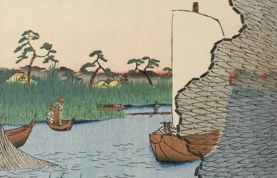 Sur la dernière estampe, également, des hérons nous attendent. Cette vue a été prise par Hiroshige au point de jonction entre les rivières Nakagawa et Tatekawa (竪川).