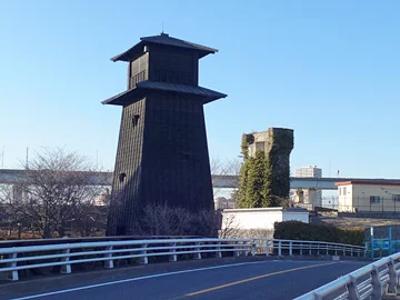 À un petit kilomètre en aval du pont Funabori, les vélos passent tout près de la tour de guet (火の見櫓 Hi-no-miyagura) de Shinkawa.