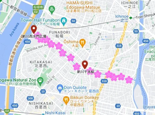 Le long de la rivière Shinkawa, on a aménagé une promenade dite des 1 000 cerisiers de Shinkawa (新川千本桜 Shinkawa Senbonzakura)…