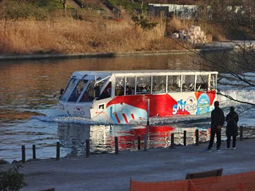 En sortant de ce parc, l’itinéraire de la journée passe par la gare fluviale Kyūnakagawa (旧中川・川の駅). Coup de chance, un bus amphibie arrive justement à la gare…