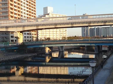 Un peu plus au sud, le parcours fait un petit détour par la rivière Shinkawa (新川), cours d’eau artificiel qui, à l’époque Edo, servit d’abord de canal pour le transport du sel de Gyōtoku (行徳) à Edo, avant de s’intégrer au réseau fluvial de transport des voyageurs de la capitale.