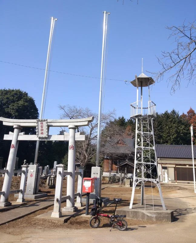 Quelque part dans la ville de Bandō (坂東市) : Béni, un sanctuaire, une boîte aux lettres et la toute petite tour de guet de la caserne de pompiers adjacente au sanctuaire