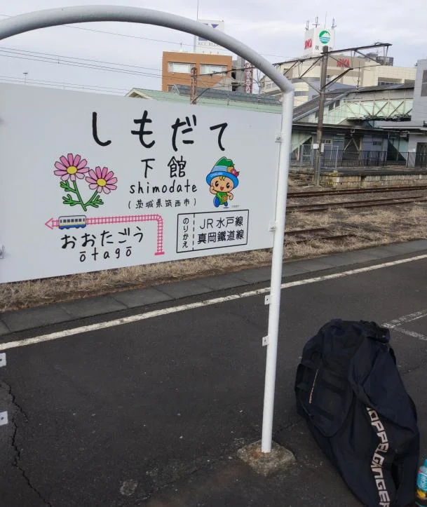 Béni dans son sac à la gare Shimodate, après une balade improvisée où nous étions, à la fin, complètement désorientés. Le GPS nous a aimablement guidés jusqu’à la gare la plus proche…