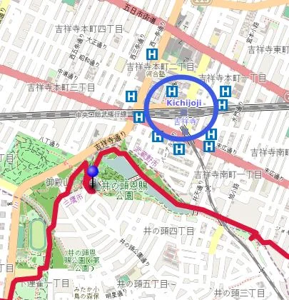 Le parc Inokashira se trouve à quelques minutes à pied de la gare 吉祥寺駅 (Kichijōji-eki) de JR, ce qui en fait un point de départ optionnel idéal pour parcourir la boucle.