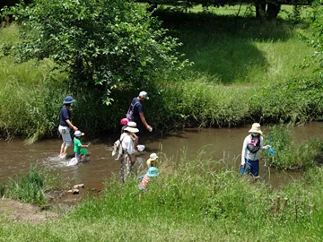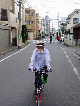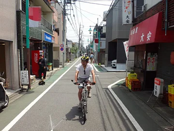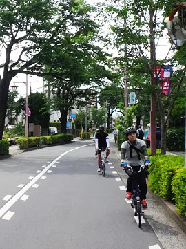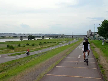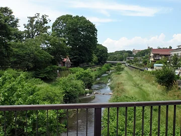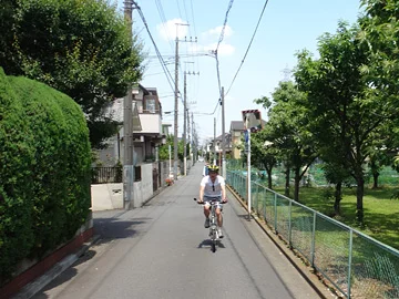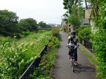 Les vélos pénètrent ensuite dans le parc Nogawa par son entrée nord, puis y longent la rivière Nogawa (野川).
