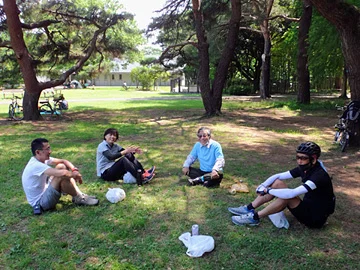 社会的な距離を保ちつつお弁当をいただき、しばしまったり。En maintenant la distance sociale entre eux, [les cyclistes] cassent la croûte et jouissent d’un moment de détente.