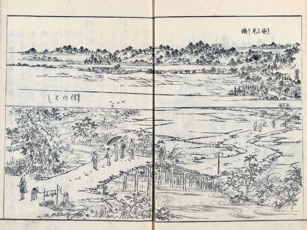 « Les ponts Sugatami et Omokage », tiré du « Guide illustré des lieux célèbres d’Edo » ( 江戸名所図会 ), (1834-1836). Le nom est clairement indiqué au-dessus de chaque pont.