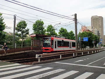 À la gare du pont Omokage ( 面影橋駅 ), le tramway arrive au moment même où le cycliste atteint le pont.