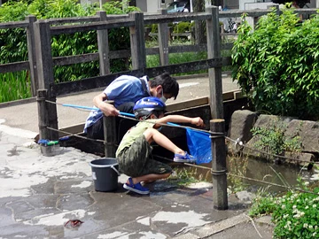 À la fin du dernier billet, nous étions arrivés au parc hydrophile 曳舟川親水公園 , sur les lieux de la deuxième estampe. Ce jour-là (le 7 juin 2020), un petit garçon y pêchait des écrevisses (ザリガニ) avec son papa.