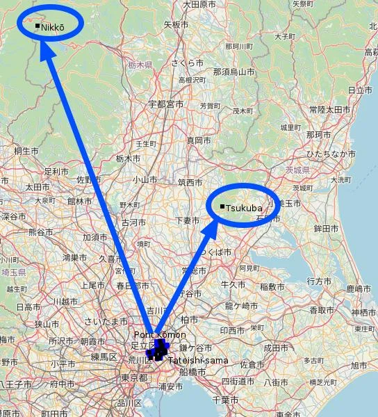 Pour nous aider à visualiser, j’ai importé les coordonnées du mont Tsukuba et des monts Nikkō dans le logiciel GpsPrune. La flèche de droite pointe vers le premier, et celle de gauche vers les seconds.