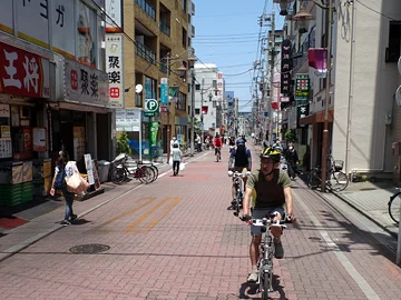 L’étape suivante de la balade est celle de la gare 亀有駅 . Les vélos s’y rendent par la rue marchande du côté nord et sont accueillis, à la sortie nord de la gare, par la statue d’un célèbre personnage de manga, le policier Ryō-san (両さん).