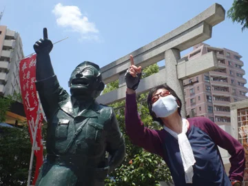 Au sanctuaire Kameari-katori, Salīna et la statue de Ryō-san dans sa pose célèbre où il invite les jeunes à viser haut dans la vie : « Allez les jeunes, visez cette étoile ! » (少年よ、あの星をめざせ!).