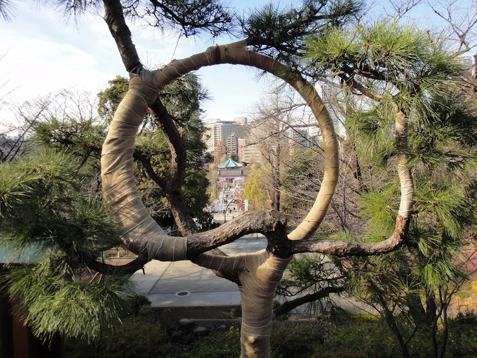 Dans le cercle de cette deuxième estampe, on aperçoit la tour de guet ( 火の見櫓 ) du quartier d’Edo où résidait le puissant seigneur Maeda du domaine de Kaga. De nos jours, si l’arbre était toujours là, on y apercevrait plutôt l’université de Tōkyō. Sur la photo prise plus haut par Geo Pottering, on aperçoit le toit du Bentendō (弁天堂), sur l’île de l’étang (ce dernier est caché par les arbres). Or, si vous regardez de nouveau la dernière planche ci-dessus, vous apercevrez ce même Bentendō, avec un toit rouge cette fois-ci, en bas à droite de l’estampe.