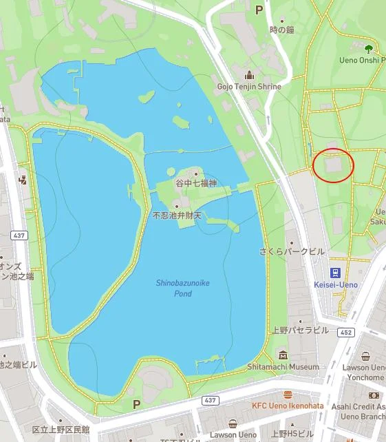 L’Étang de Shinobazu et une partie du parc Ueno. Le cercle rouge indique l’emplacement du Kiyomizu Kannondō (Source de la carte : OpenStreetMap)