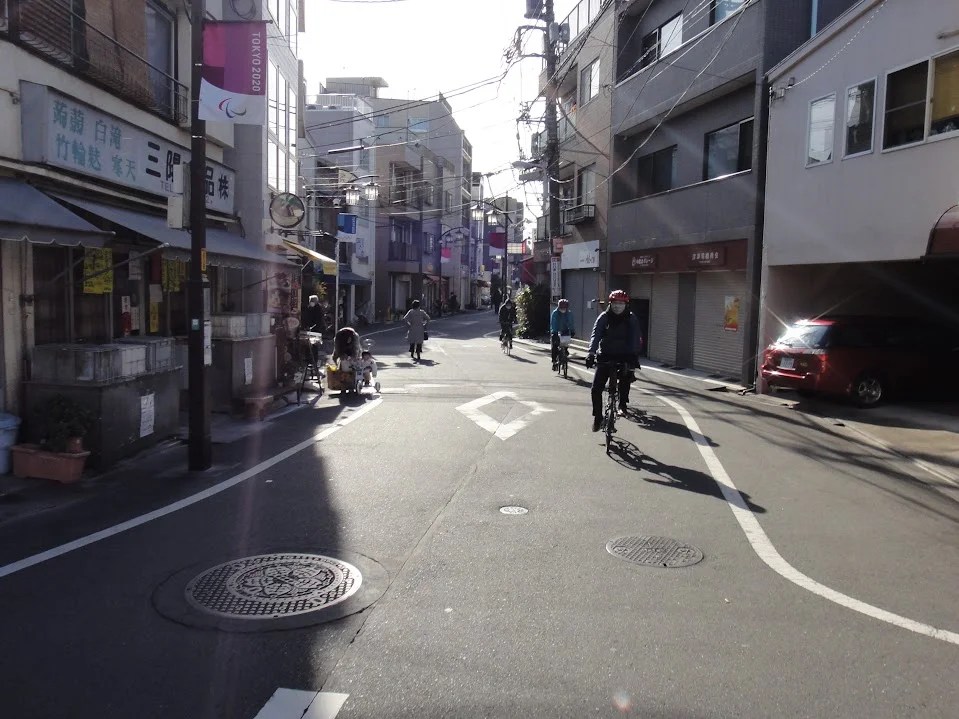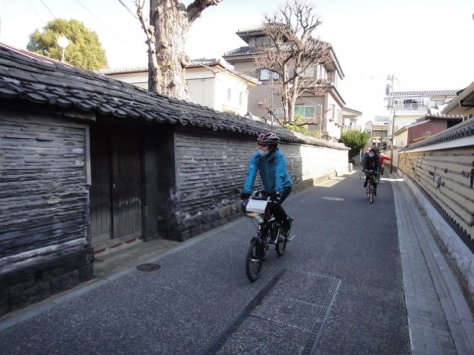 Les vélos et leurs cyclistes passent ensuite devant le mur de pisé (torchis) du temple Kan’non-ji d’Ueno ( 観音寺築地塀 ). Ce mur de tuiles empilées en alternance avec de l’argile est inscrit au patrimoine culturel matériel du Japon.