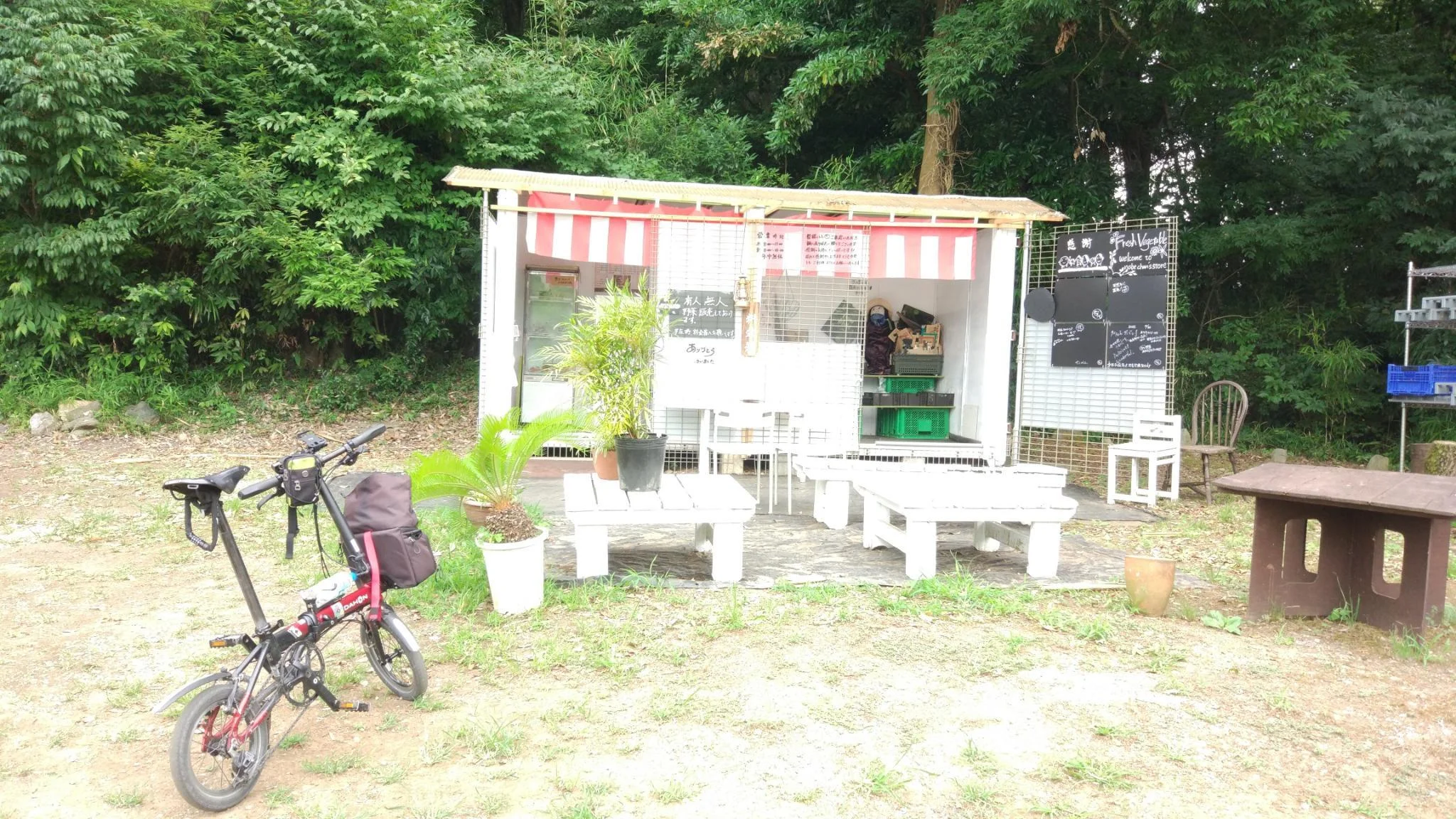 Ça, c’était l’après-midi. Mais un peu avant midi, la chance nous a beaucoup souri en nous faisant passer, au hasard d’un détour provoqué par un pont à l’accès barré pour travaux de rénovation, devant un kiosque de légumes. J’y suis entré pour acheter quelques trucs à me mettre sous la dent, mais la dame a insisté pour me donner toute une variété de mini-tomates, des poivrons (ピーマン), des gombos (オクラ), puis une petite pâtisserie (ça ressemblait à un manjū, mais c’était autre chose, elle me l’a dit… et j’ai oublié).