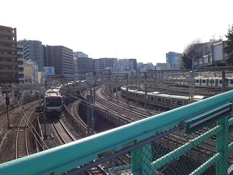 La balade passe ensuite par le pont Shinzaka-kosenkyō (新坂跨線橋). Les kosenkyō sont des ponts qui passent au-dessus d’une voie ferrée. Celui-là a ceci d’original qu’il offre une vue… non pas sur des rizières en terrasses, mais sur des voies ferrées en terrasses. 😀 (Ueno, en hauteur, se trouve à droite sur la photo.)